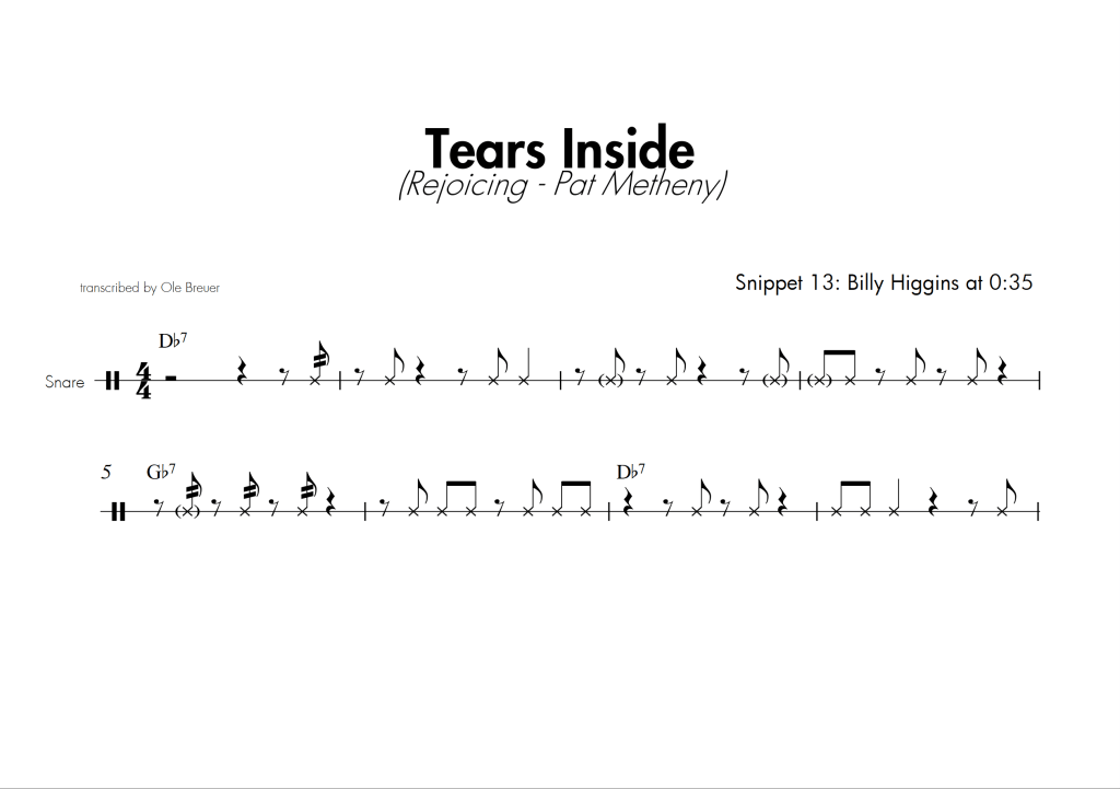 Anbei eine Transkription des Snare-Compings von Billy Higgins zum Stück “Tears Inside”. Erschienen auf “Rejoicing” von Pat Metheny aus dem Jahr 1984. Leider ist die Aufnahme im Netz nicht frei verfügbar, nur mit YouTube- oder Spotify-Premium.